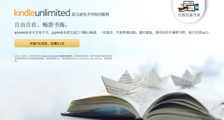 目前亚马逊 Kindle 电子书上架超过 30 万本电子书,落地中国不久的 Kindle unlimited 包月服务,也如同一个图书馆,每月交 12 元就能随意借阅亚马逊电子书店中 4 万本中文书籍和 3500 本英文书。
