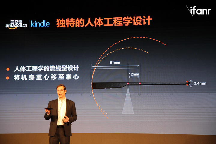 在采访之前的发布会中,Letourneur 也重点介绍了 Oasis 所使用的人体工程学设计,通过上面这张图,也能直观的解释出,为什么在 Kindle Oasis 的体验中,我们感觉这款设备是最关心手感的一款 Kindle。对屏幕显示效果不做太多修改,而是进一步通过人体工程学设计提升手感,也是 Kindle 的一大提升。就像爱范儿主编何宗丞所说: