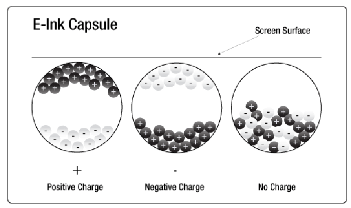 简单来说,电子墨水屏由许多电子墨水组成,电子墨水可以看成一个个胶囊的样子,每一个胶囊里面有液体电荷,其中正电荷染白色,负电荷染黑色。通过电压的高低转换实现正负电荷(黑白电荷)的吸引和排斥,这样就形成了我们看到的黑白两色。