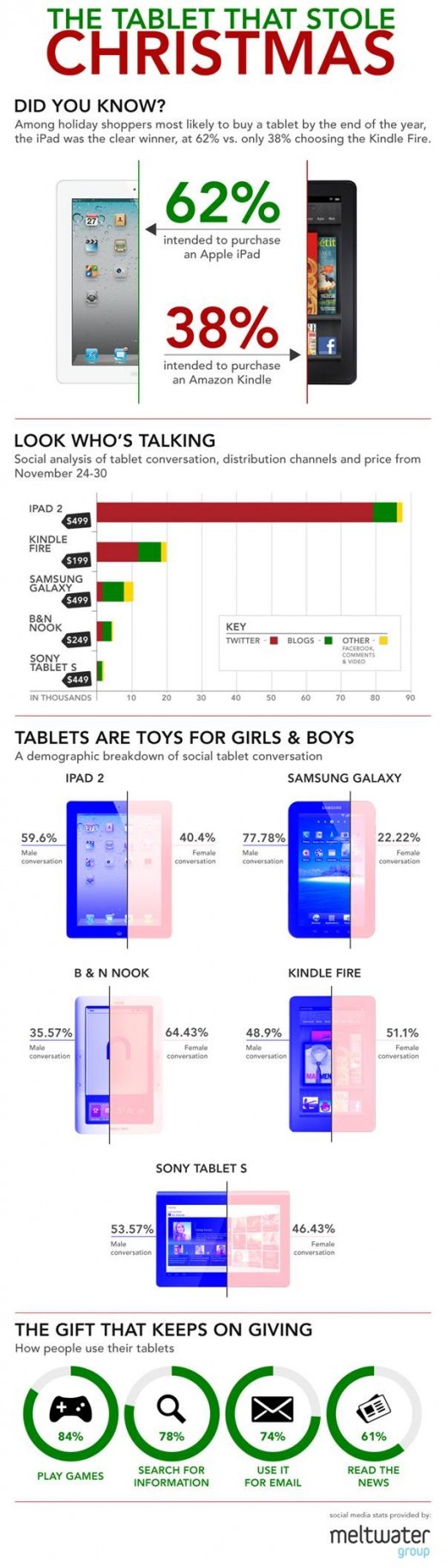 为了调查人们偏爱哪个平板电脑,Meltwater Group 利用一个名为 Meltwater Buzz 的工具,跟踪人们的兴趣。结果不出所料,iPad 成为人们最想要的平板电脑,这与它的市场地位有关,在今年第三季度 iPad 在全球平板电脑的份额为 61.5%。不过,Meltwater Group 也发现一个有趣的事实,那就是女孩子更加偏爱 Nook Tablet。
