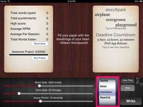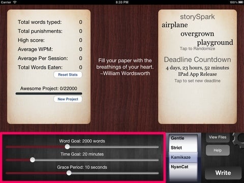 除了 iPad 应用以外,Write or Die 还有有桌面端(基于 Air 平台,支持 PC、Mac),要价都是 10 美元。WoD 还有网页版,基本功能和 iPad 差不多,可以体验一下“自杀式的”惩罚是怎样的。可惜网页版并不支持中文的字数统计模式,写了一大段话,都统计为一个字。