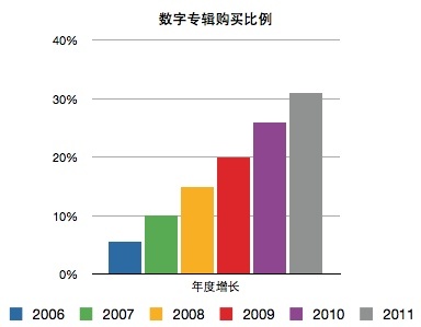 数字专辑销售从 2010 年为 8640 万美元,2011 年增长至一亿美元,增长幅度差不多达 20%。数字专辑购买比例占整体专辑购买的 31%,也就是说消费者每买入三张专辑,有一张就是数字专辑。这个比例逐年攀升: