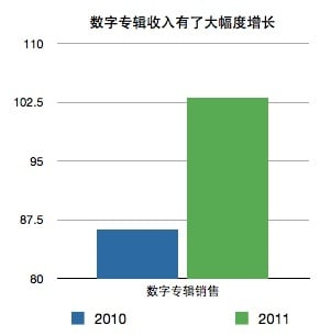 2011 年成为音乐产业的扭转之年,来自数字音乐的收入超过了传统音乐的收入,这将是一个信号,代表数字音乐实实在在的成为拉动音乐产业增长的主要动力。这能带动音乐产业的复苏——今年的新专辑发布数量已经从去年的 75159 张增加到今年的 76875 张。