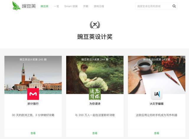 豌豆荚设计奖只选择设计够好的,从不要考虑下载量。所以你经常会看到一些名不经传的小应用,也登上了豌豆荚设计奖。