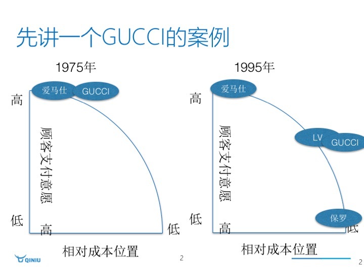 Gucci,在当时,和爱马仕和香奈儿处于同一个水平。它的战略定位是高端奢侈品,它的成本高,但顾客支付意愿高,超过了利润边界。也就是,1975 年的时候,它代表着典雅、高贵和成功。
