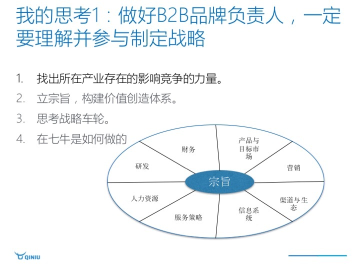 以我的经历为例子,我 2012 年加入七牛。加入公司后的第一件事,不是做活动营销,也不着急开始投广告。而是花了大量的时间,去理解七牛产品,分析产业链的现状等,梳理出属于七牛的竞争力模型图,分析七牛整体的定位应该是什么。