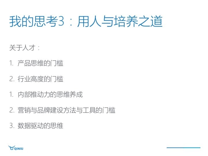 曾经有一年年会,我在年会上说,七牛除了对外做品牌,对内做品牌,我还说了一句话就是“我们全民皆市场,全民要营销”,全民做品牌管理,就是不断得你的公司里去注入对品牌的理解,品牌的概念。
