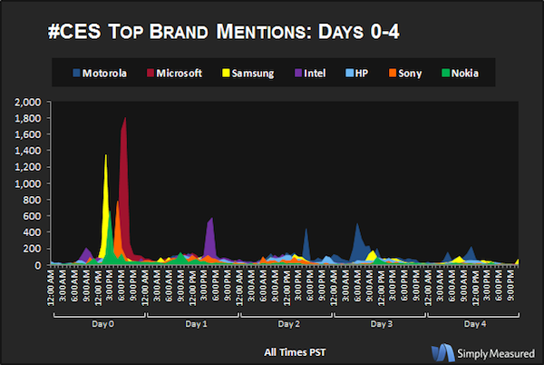 在 CES 上,最受人们关注的品牌有哪些?TechCrunch 的结论(根据关注度,由高到低排列)是:摩托罗拉、微软、三星、英特尔、惠普、索尼、诺基亚。