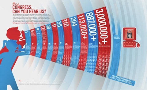 在 11 月,关于 SOPA 就有一场论战,当时的《纽约时报》的这篇声明用了一整个版面,《为了保护创新,我们站在一起》(We stand together to protect innovation)。这篇联合声明中提到: