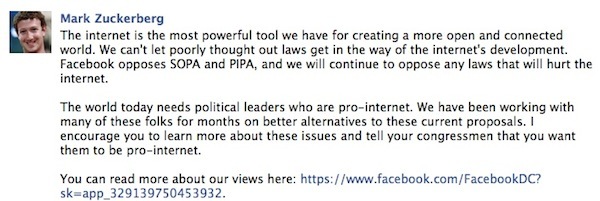 Mark Zuckerberg 在 Facebook 上发布一则消息,直接反对 SOPA 法案。他说: