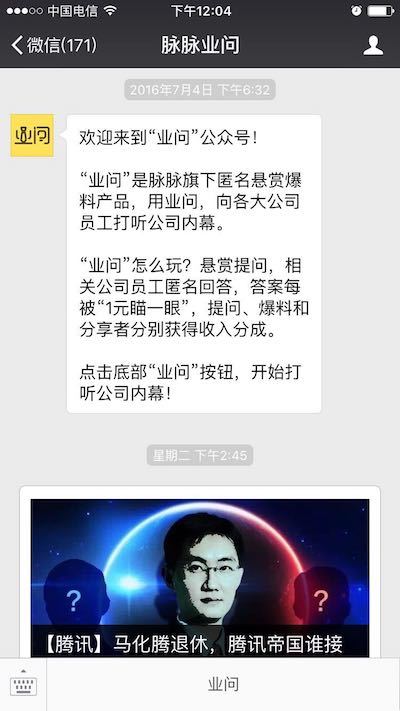 业问,我们现在在做脉脉业问,是一款匿名悬赏爆料的产品,有点类似于职场版本的“分答”,不过和分答只针对少数大 V 人群不同,脉脉业问是针对中国 2 亿职场用户,脉脉业问尝试让数亿职场用户的知识、经验、技能得到变现。