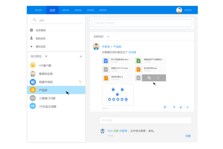 「动态」:是一个开放的讨论区,方便用户将自己的想法、需要知会的事情等在可选范围内发布。和群组以人为中心的讨论不同,你可以随时在「动态」当中发布任何一件事情,激发他人共同的讨论和参与。