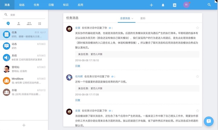 比如说,在评测过程当中,因为要和明道讨论产品的使用,因此工作人员将我和产品总监邀请到同一个「任务」当中。在这个任务下方,我提出了一些我的问题,对方的回复之后,直接出现在我的「消息」页面上,直接回复即可。不必再打开相关的「任务」才回复。从「工作流」的角度来看,「消息」的设计避免了沟通语境的打断。