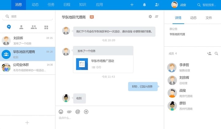 换言之,你可以简单地通过明道这各协作平台,跟别人沟通某个项目进展,共同参与某个任务,共享同一个日程,以及文件。它已经覆盖了协作的各方面需求。