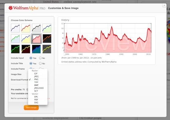 首先,可以导出由 WA 搜索得到的结果。下图是导出界面,可以自订数据图的颜色,以及包含的字段,也可以选择导出的文件格式,包括 GIF、JPEG、PNG、 PDF 等。搜索结果还可导出为 CDF 格式,数月之前由 WA 发布的一种新文件格式,在电脑上安装了相应的播放器后,能够动态显示表格、图像和数据。
