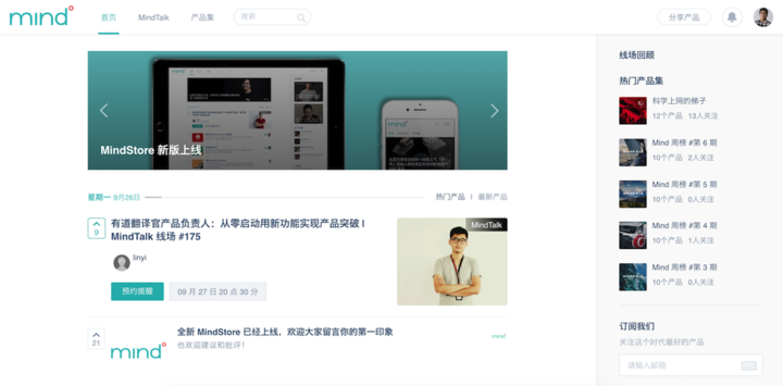 现在,MindStore 的首页布局增加了大量的图片元素,首页顶部出了大 Banner 区,可以展示最新一期的 MindTalk,以及每周「Mind 周榜」评选出的明星产品等等。