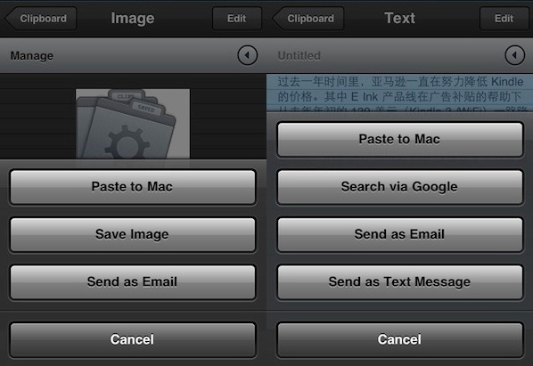 在 Pastbot 和 Pastebot Sync 的帮助下,用户不仅可以从电脑粘贴东西到 iPhone 上,还能够把手机剪贴板中的文字,图片贴回到电脑中。而且针对图片和文字,还能有不同的选项: