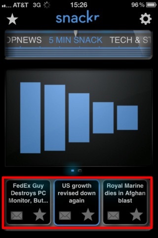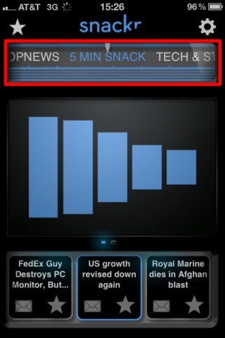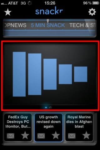 iPhone 上已经有很多新闻阅读器,但都是文字和照片的阅读组合。Snackr 这款阅读器则像一个新闻广播电台,它把新闻读出来,每条 5 分钟。非常适合外出使用。