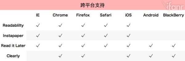 目前,Readability、Instapaper、Read it Later、Clearly 都主要依托浏览器来抓取信息,因此多浏览器的支持对于它们而言很重要,移动平台的多平台支持也同样重要,两者直接影响到这四个服务用户群的大小。