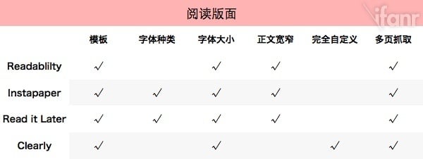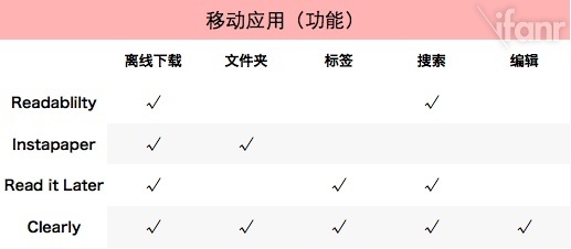 实际上,Read it Later 比较注重“内容整理”功能,在应用界面上,搜索框无处不在,而且还提供了“标签”,能够通过标签来管理待阅文章。而 Instapaper 则提供了“文件夹”的形式来给文章分门别类,Clearly 依托的 Evernote,在整理内容上有得天独厚的优势。三个服务的功能对比可看下图: