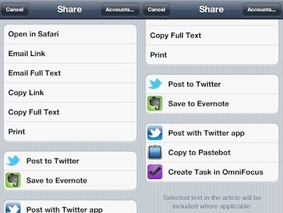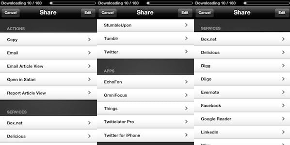 Read it Later 的分享渠道最多样化,能够分享到多个流行的服务中去,包括 Box.net、Delicious、Digg、Tumblr 等等: