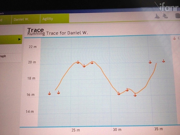 在Highlight Tour上,负责人还向我们展示了他们为这项技术专门设计的 App。图一是测试者在场地带球奔跑的轨迹,图二是相应带球时的冲刺时间,和每次向左或是向右转身的时间。精确到这种程度,不禁让人很难想象,那个小小的芯片怎么会这么厉害。