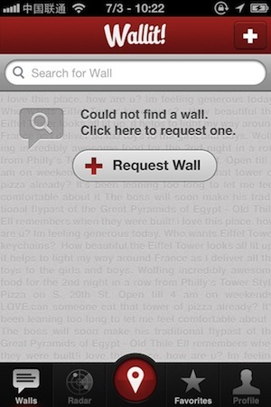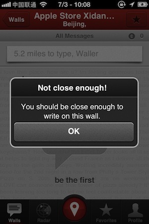 可惜我现在身处的位置比较远,无法在最近的留言墙,也就是北京西单的 Apple Store 上留言。这证明 Wallit 强调的是同一场景下人群之间的互动,不在一个场景下的人,不能参与。