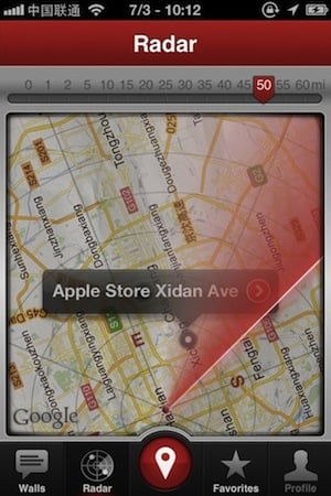 Radar 是 Wallit 上比较具备科技感的功能,在底部的导航栏点击它后,就进入雷达扫描界面,通过它能够扫描附近留言墙的位置。和电影用中看到的雷达一样,当 Radar 侦测的留言墙后,会在地图上显示小点,而且界面的上部有一个滑动条,拉动它的话能够调整侦测的范围。下图中,我把 Radar 侦测的范围几乎放到最大,还无法覆盖整个北京城,这种设定对于 Wallit 这种不以导航为目标的应用来说是适合的。