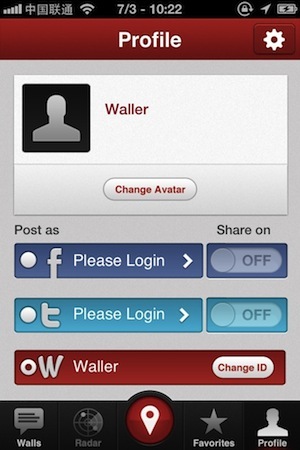 有趣的是,用户在留言墙上留言无须申请账号,当然,也可以选择与自己的 Facebook 和 Twitter 连接起来,在 Wallit 发布留言的时候,也同步到社交网络中去。不过,每名用户默认的名字是“Waller”,所以,其实 Wallit 允许匿名留言。