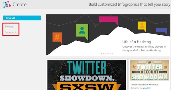 从上图中我们可以看到,Visual.ly 目前只能导入来自 Twitter、Facebook 的数据,而且需要和用户的账号相连。