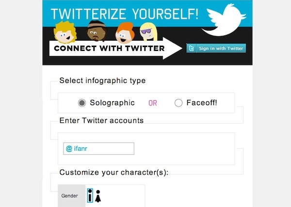 另外一个利用 Twitter 制作信息图的功能叫 Twitterize Yourself,能够根据 Twitter 账号生成一个人偶图片,并在下方标注和账号有关的 Twitter 状态,大家可以在这里查看 ifanr 的 Twitter 人偶。