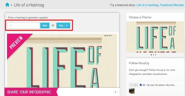 由于 Hashtag 已经成为社交网络中常见的一种聚合话题的形式,因此 Visual.ly 也提供了利用 Hashtag 进行数据挖掘的功能:Life of a Hashtag。只要在输入一个特定的 Hashtag,Visual.ly 就会把和这个标签有关的情况制作成信息图展现出来。