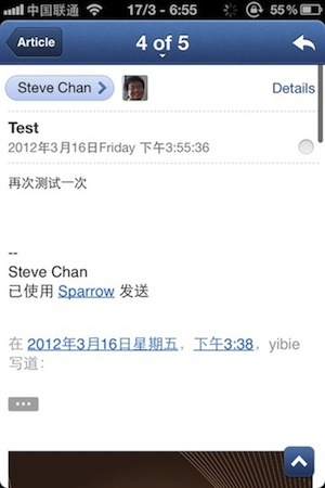 和 Gmail 一样,Sparrow 也支持“对话式邮件”,将同一个话题的邮件都归集到一起,方便用户查看。不过,Sparrow 的操作更多的利用到滑动手势:用手指往上拉,可以转到最新的邮件;往下拉,则可以转到之前的的邮件。