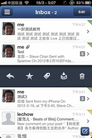 我的使用结论是,iPhone 版 Sparrow 至少是值得一试的邮件客户端,无论从界面还是操作,它都称得上是轻巧。