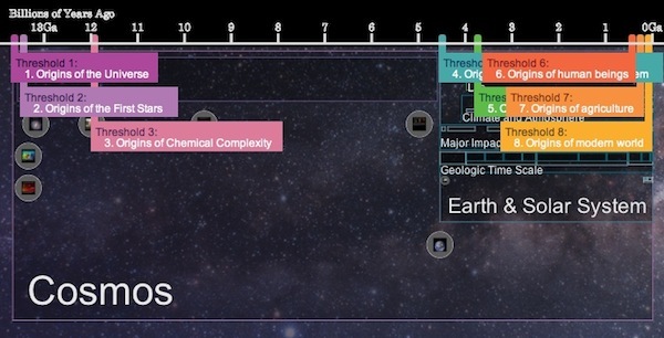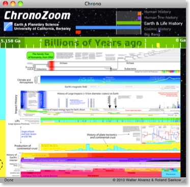ChronoZoom 并非一个突然出现的项目。2009 年春季,加州大学伯克利分校的学生 Roland Saekow 决定参加 Walter Alvarez 教授的“Big History”课程,这是一个强调以宏观的历史观,来看待历史进程。它不仅仅关于人类,不仅仅关于地球,还关于宇宙。“Big History”强调打破各个领域的界限,让我们对宇宙与世界的理解融为一体。