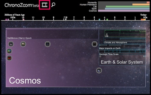 打开 ChronoZoom 的主页,我们会发现 ChronoZoom 利用时间轴来统合各个历史时期的数据,主要有五个维度:人类、史前人类、生命、地球、宇宙。