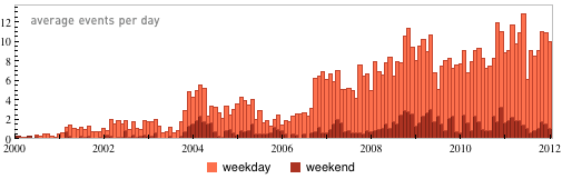 除了电子邮件以外,他还统计了自 2000 年以来,记录在日历上的事件。我们可以看到,自 2002 年后,日历上的事件开始增加,而且 2002 年之前的事件是很少的,这和他花大量的精力和时间投入到《A New Kind of Science》有关。然而,书完成了之后,他就开始投入更多的精力到公司事务上,而随着事务的增加,一些例行的事务也开始增加。