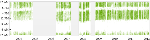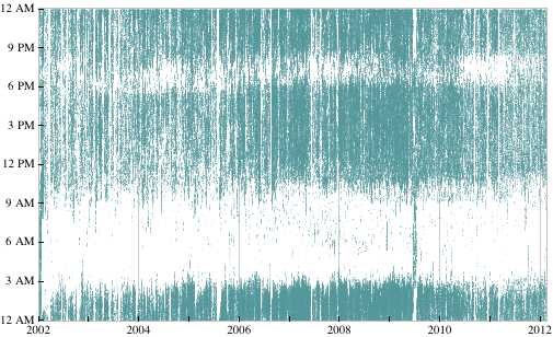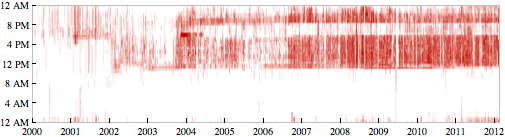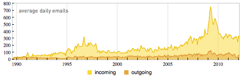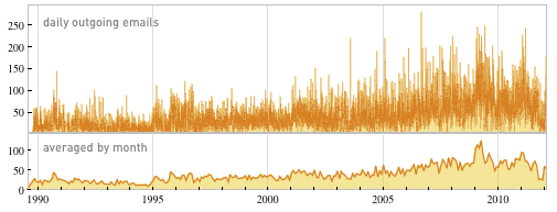 第二张图片也与电子邮件有关。这张图片统计了 Stephen 每日、每月发送邮件的频率,同样,是从 1989 到 2012 年,我们会发现这频率在增高,其中一个高峰在 2009 年。原因是,Stephen 公司的项目越来越多,而在 2009 年正好是 Wolfram|Alpha 上线的时候,所需要的准备也相当的多,大量的沟通成为必要。