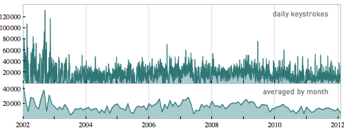 而从 2002 年开始,Stephen 每天每天敲击键盘的次数,从上方的分布图而言,和 Email 的分布图在图形上是基本一致的。有趣的是,他还记录自己敲击每个按键的次数,意外的发现,退格键(backspace)的敲击次数占据了 7% 的比例,这是他以前没有想到的。