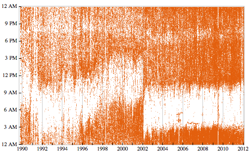 第一张图片展示他自 1989 年到 2012 年间发电子邮件的记录。其中 1989 年至 2002 年间,他发邮件的时间都非常不规律,之后便趋于稳定。Stephen 说他会在一天中的任何时候发电子邮件,甚至在午餐小憩的时候也会发。生活基本上两点一线:邮件、睡觉。一般他会在凌晨 3 点入睡,然后在上午 11 点时起床。