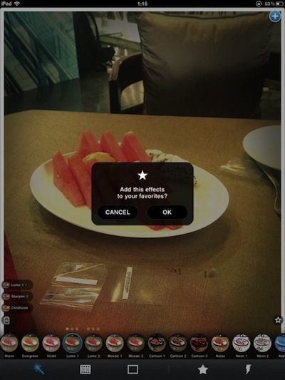 Pix 允许用户最多选择三种特效,为图片增加效果,比如这张水果拼盘,我添加了两种特效。而如果对某个特效不满意的话,点击左下角的垃圾桶图标,可以把所有特效效果清除,或者是点击某个特效的的名字,那么就可以把这个特效消除掉。