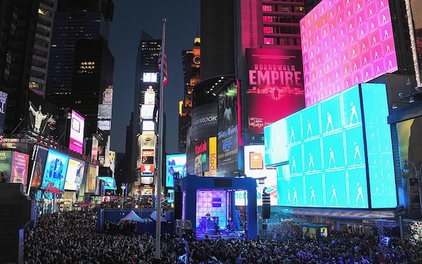 这场声势浩大的宣传攻势在周五晚上就正式拉响了。在纽约曼哈顿人流最密集的时代广场,诺基亚架起了用“诺基亚蓝”涂装的巨大正方体舞台。配合时代广场建筑群中最大的 LED 广告墙,声色俱全的狂欢派对在 Nicki Minaj 的 Starship 中将气氛推至顶峰。占满第 42 大街与弗洛德街三角地的人潮或许还弄不清 Windows Phone 是什么,但他们一定记忆犹新的是,LED 墙上不断闪现的 Lumia 和那支看上去和 iPhone 截然不同的诺基亚手机。