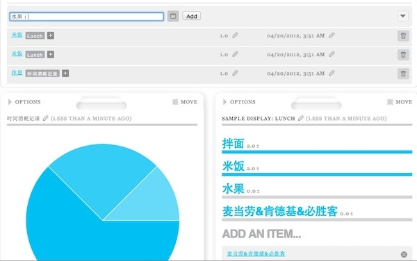 为什么说 Daytum 能够记录任何方面的数据呢?因为 Daytum 中容纳各个不同类别数据项目的“面板”具备非常灵活的自定义选项,用户可以自由设定每个面板负责记录的数据项目。比如图中的“时间消耗记录”和“Lunch”面板,一个记录花在不同事情上的时间,一个记录自己午饭吃过什么。假如用户觉得自己记录的数据项目不够多,那么还可以直接点击面板下方的“Add an item”来添加。