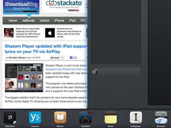 MultiLayer 如何实现多任务管理功能?iDownloadBlog 称,用户可以另外一个要用的应用拖入 MultiLayer 中,这样便可以同时做两件事,比如一边用 Safari 上网,一边在 MultiLayer 上发微博。到底它是如何使用的,可以看一个比较原始的演示视频: