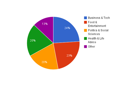 结果是,Quora 不论是话题质量还是话题涵盖的范围都取得很好的平衡。Quora 的数据分析师 Yair Livne 对最近三个月以来,得票数超过 3 的回答进行统计。她发现,Quora 的问答范围不局限于硅谷和高科技公司。在下图中,商业与科技、食物与娱乐、政治与社会科学、健康与生活建议这几个分类所占的比例均十分接近。