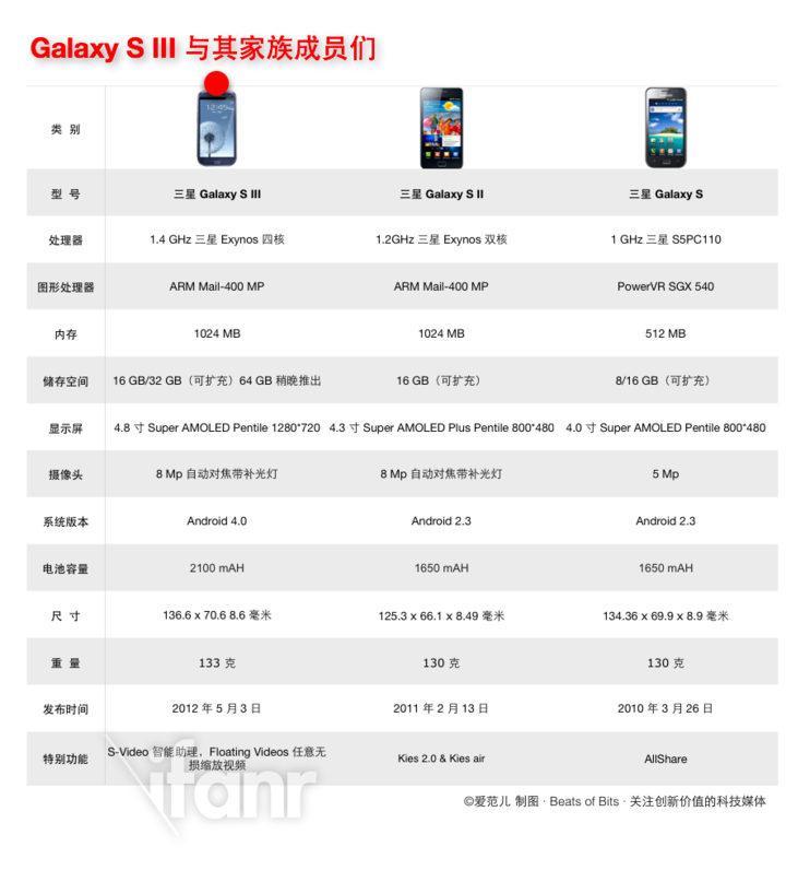 今天凌晨,三星在伦敦发布了自己的第三代 Android 旗舰机型 Galaxy S3,以及配套的一系列软件、配件与服务。Galaxy S3 的规格和此前各方猜测差不多,包括 1.4 GHz Exynos 4 核处理器、4.8 英寸 Super AMOLED HD 显示屏、800 万像素后置摄像头、支持 1080P 拍摄的 190 万像素前置摄像头、16GB / 32GB 内置闪存(未来会提供 64GB 版本)、microSD 扩展。很可惜 GS3 的屏幕并未像传言一样采用 RGB 像素排列,而是像 Galaxy Nexus 一样采用只有正常屏幕 2/3 亚像素的 Pentile。