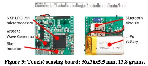 x 36 x 5.5 毫米的 Touché,所采用的是一颗 ARM Cortex-M3 微处理器 NXP LPC1759。这颗微处理器的体积极小,运行频率却能达到 120 MHz,满足 Touché 对处理器性能的要求。