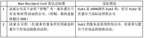 由于美国的法律是依据公司注册地来判断其是否为美国公司,因此,Sub1 会被美国的法律视为爱尔兰公司。而爱尔兰的法律则依据公司实际运营、经营活动地来进行判断。那 Sub1 要如何被认定为 Non-resident Irish呢?