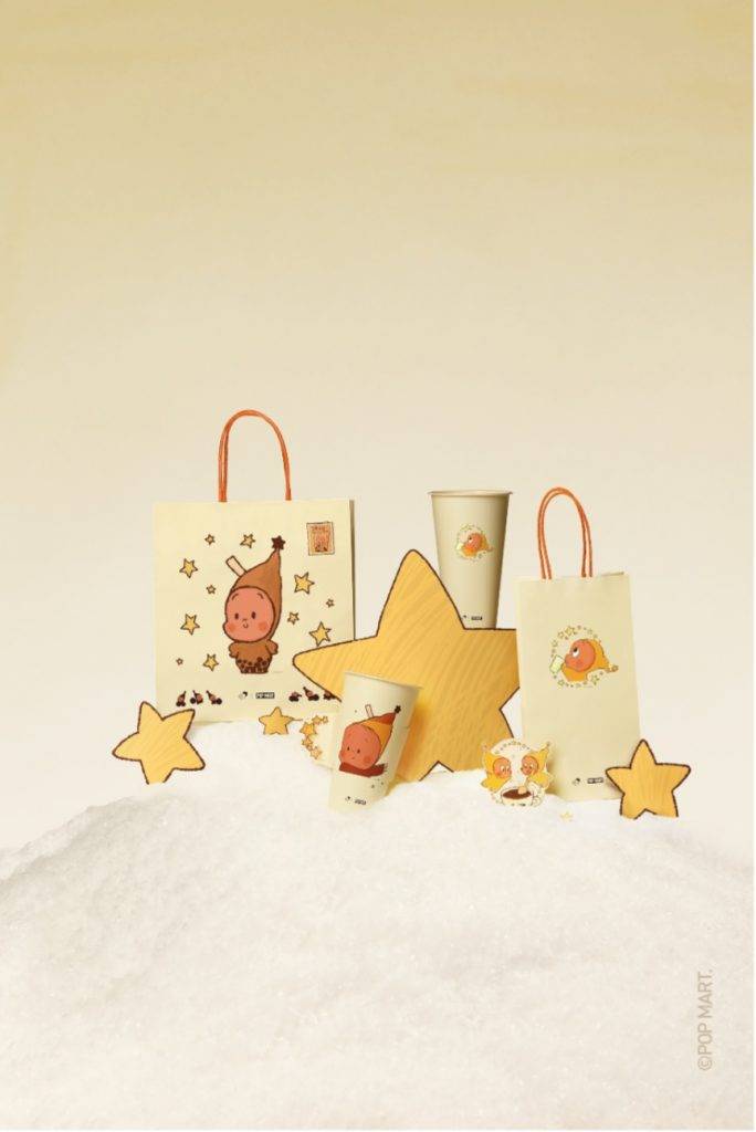 伴随产品上新,喜茶同时推出基于全新星星人形象设计的,包括饮品杯、纸袋、杯套在内的全线联名限定包材,以及灵感小卡、贴纸、徽章、茶碗等限定周边,满足IP粉丝的各式收藏需求。联名杯套上还藏有设计小彩蛋,转动杯套时,可以为杯子上的星星人戴上围巾,温暖就从手中的喜茶传递开来。