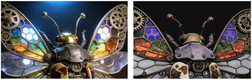 除了结构还原,Hitem3D 2.0 解决了光影干扰痛点,避免将复杂的环境光直接“焊”在模型上造成色彩脏乱。以机械蝴蝶为例,即便原图有强烈的聚光灯干扰,系统也能智能剔除,还原出齿轮真实的黄铜质感与翅膀原色,让全彩打印不再“脏兮兮”。